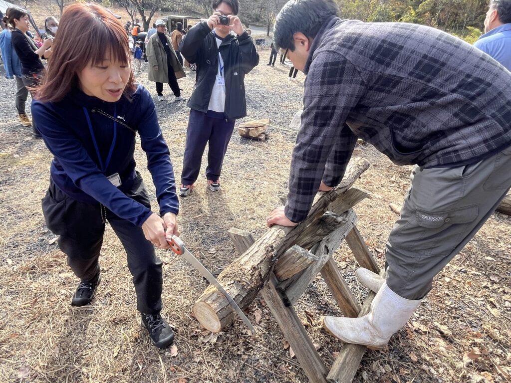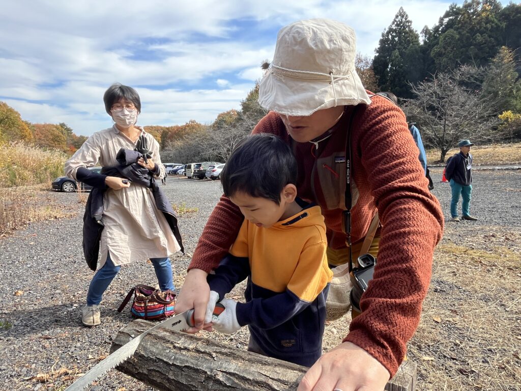 薪割り体験は、斧による薪割りとキンドリングクラッカーによる薪の小割りを行いました。またノコギリによる小径丸太の丸太切りも体験してもらいました。
