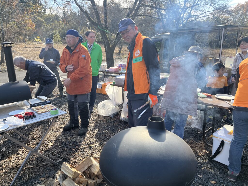 今回もファイアーボウルやミニストーブ、ピザ窯大中小3台、バーベキューコンロを持ち込み、ピザやピザトースト、フランクフルトソーセージ、焼き芋を焼いて提供しました。またマシュマロやうまい棒は参加の皆さまが自ら串に刺して焼いたり、中にはミカンを焼く子もいて、皆さん思い思いに煙にまみれながら楽しんでいただきました。今回は開催時期が遅くなったこともあり、寒さ対策として温かい飲み物も用意し好評を博しました。